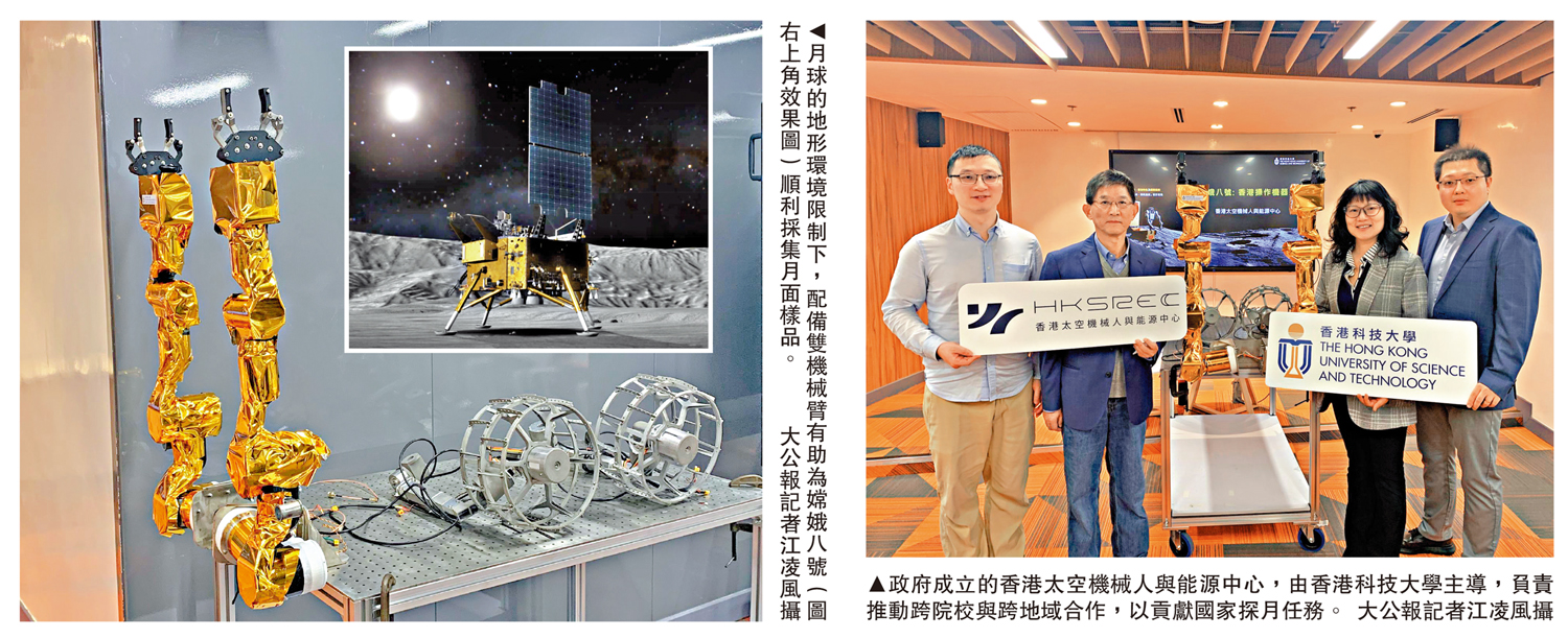 為支持該項目,特區政府成立的「香港太空機械人與能源中心」由科大主導,負責推動跨院校與跨地域合作。科大負責設計核心「操作大腦」,「香港操作機械人」配備雙機械臂,是全球深空探測領域首次應用此類機械人,能夠部署和安裝儀器、採集月面樣品等任務。\大公報記者 江凌風