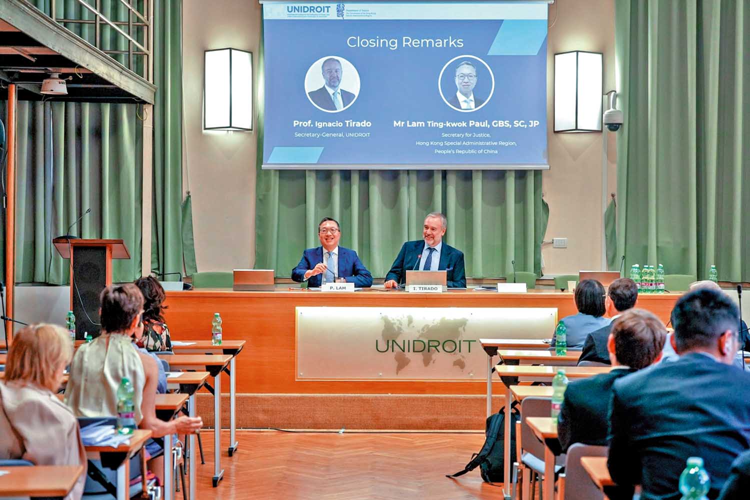 圖:今年7月,律政司司長林定國(左)與國際統一私法協會秘書長Ignacio Tirado(右)在意大利羅馬出席由律政司和國際統一私法協會合辦「香港:通往亞太區的門戶」研討會。