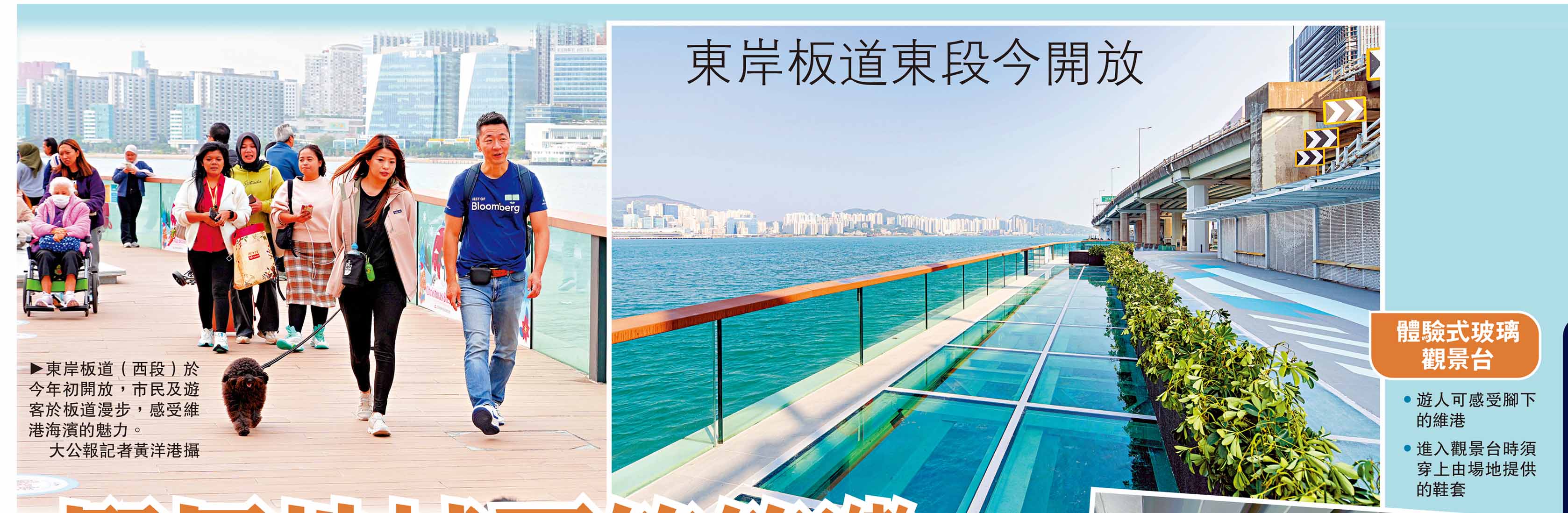 東岸板道(東段)有多項特色設施,包括體驗式玻璃觀景台,遊人可站在玻璃地面,感受「腳下的維港」;小食亭與餐飲設施則預計於明年首季開放,不少遊人表示十分期待在維港海濱有全新體驗。\大公報記者 黃佩琳