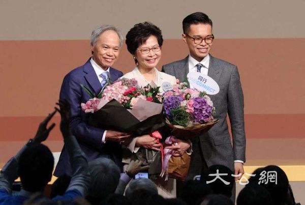 3月26日,剛剛當選為行政長官的林鄭月娥與丈夫林兆波(左)、長子林節思(右)合影。 大公網記者何嘉駿 攝