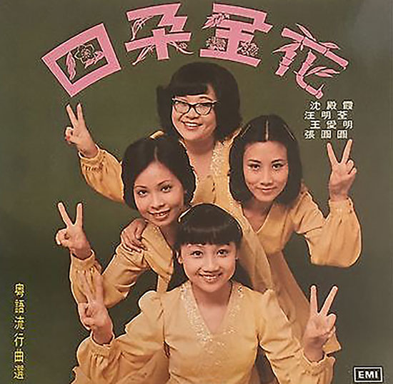 70年代,香港無線電視翡翠台晚間節目《歡樂今宵》裏汪明荃(中右)、沈殿霞(後)、王愛明(中左)及張德蘭(前)組成的TVB「四朵金花」