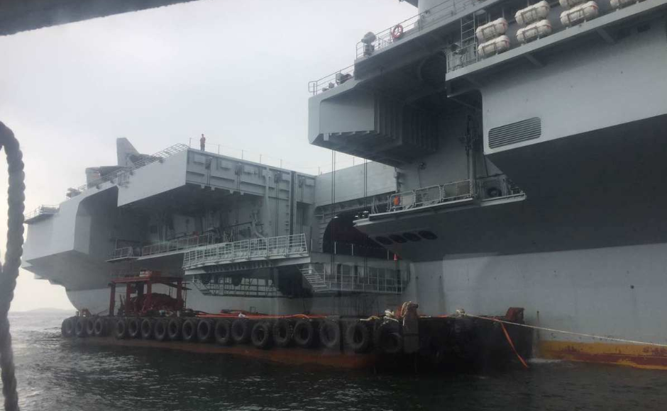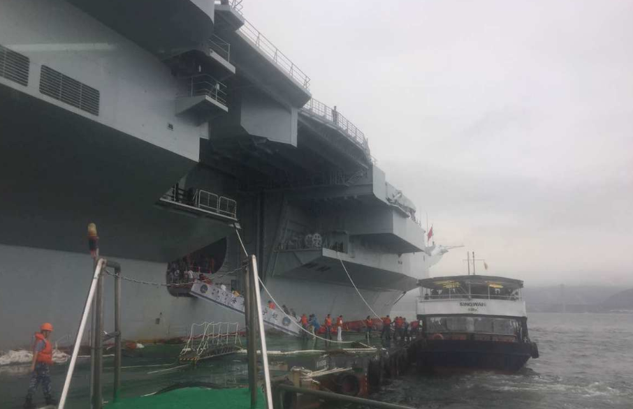 接駁艇停靠遼寧艦後,逾三十名解放軍海軍親切護送市民登上遼寧艦。