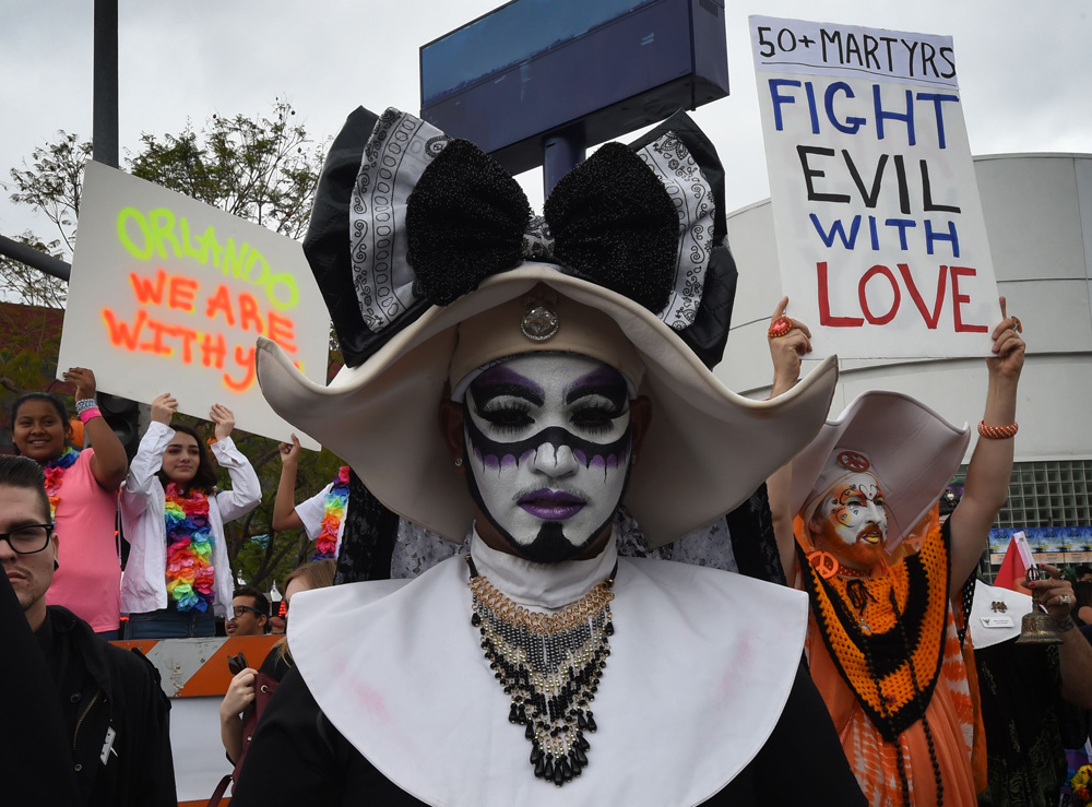 圖:洛杉磯12日的同志遊行中,參與者向奧蘭多事件遇襲者致意\法新社