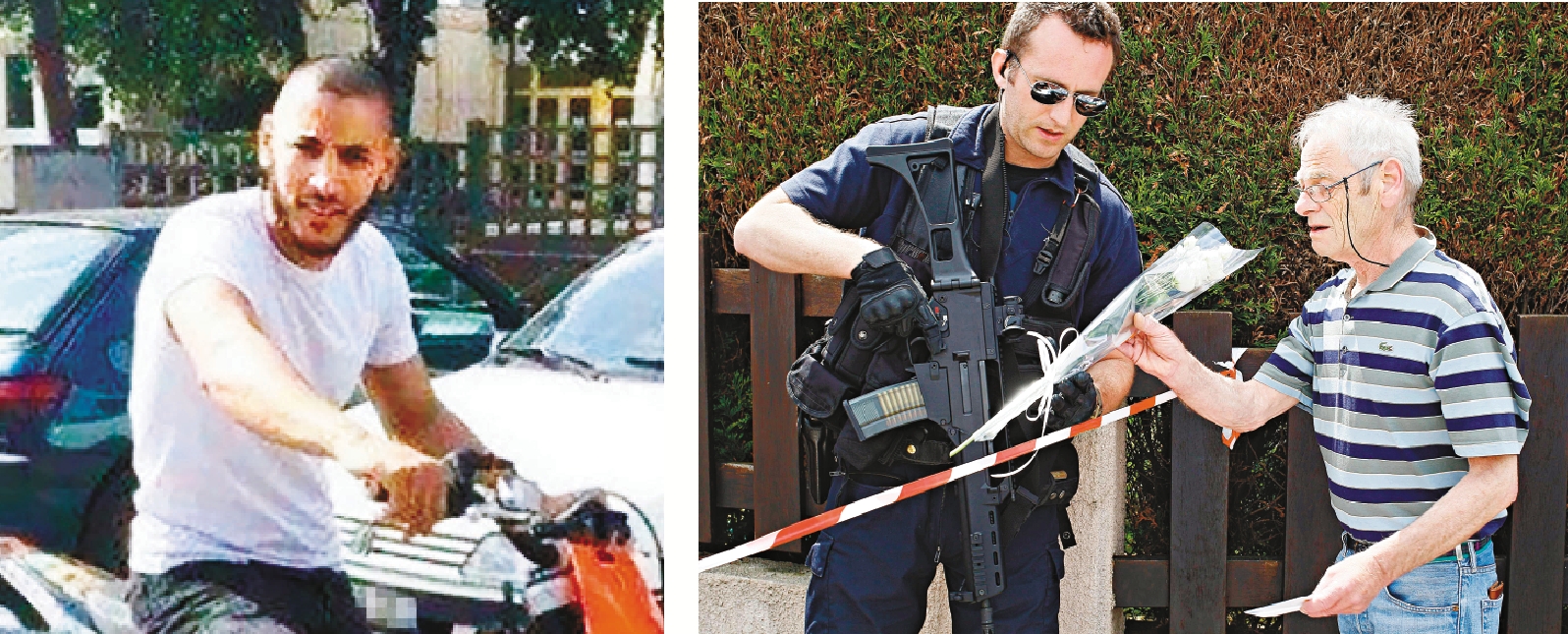 ?正舉行歐國杯賽事的法國巴黎13日晚發生一起殺警事件。據稱效忠極端組織ISIS的刀手,殺死一名警員及其妻子,並在Facebook網絡直播,揚言要讓正在法國舉行的歐國杯足球賽「成為墳場」。最終反恐特警衝入擊斃兇徒,解救人質。左圖:兇徒刀手阿巴拉。右圖:當地住民送花到現場悼念被害警員 法新社