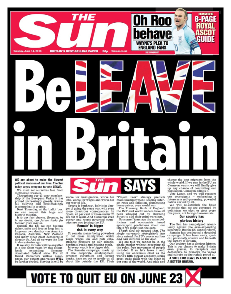 英國傳媒大亨梅鐸旗下的暢銷小報《▉▉太陽報▉▉》,14日在頭版刊發一篇全版社論,呼籲讀者支持脫歐。該社論以「相信英國」(BeLEAVE in Britain)為標題,但在「相信」(believe)一詞中把後幾個字母放大,形成「離開」(leave),達到一語雙關的效果。社論又打出醒目的副標題:「這是我們脫離布魯塞爾這個不民主機器的最後機會,是時候把握住它了。」