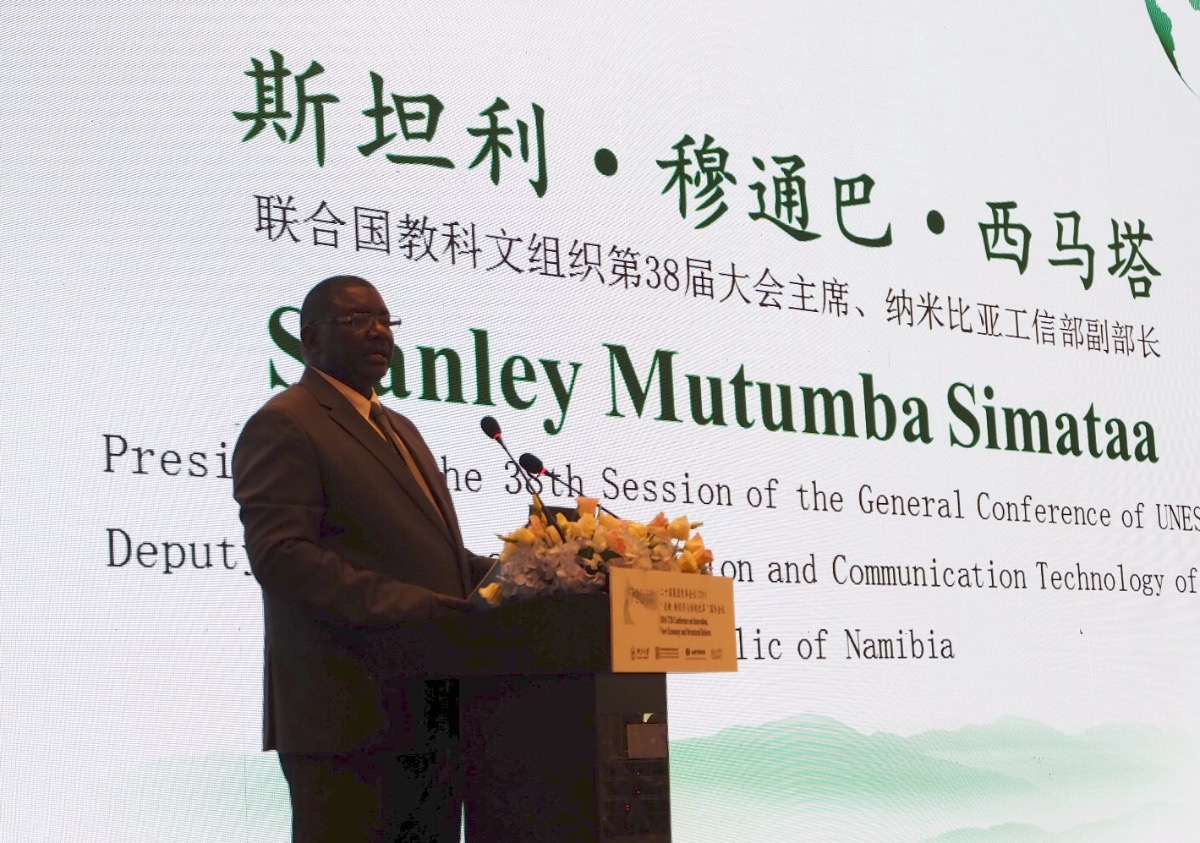 聯合國教科文組織第38屆大會主席斯坦利·穆通巴·西馬塔在大會發言