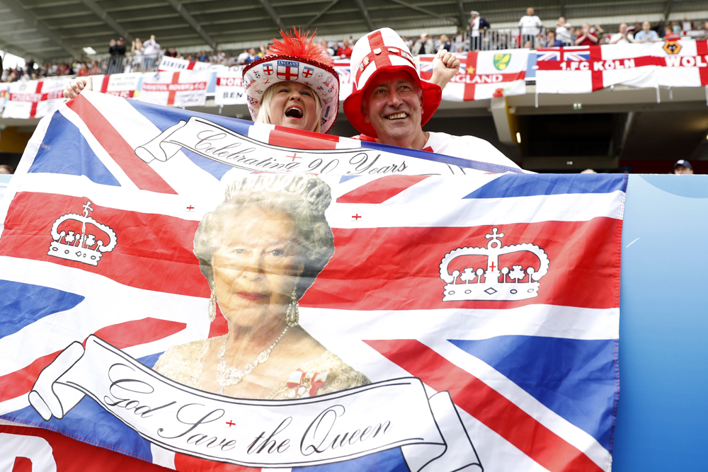 圖:英格蘭球迷帶上印有英女王頭像的旗幟觀賽/路透社