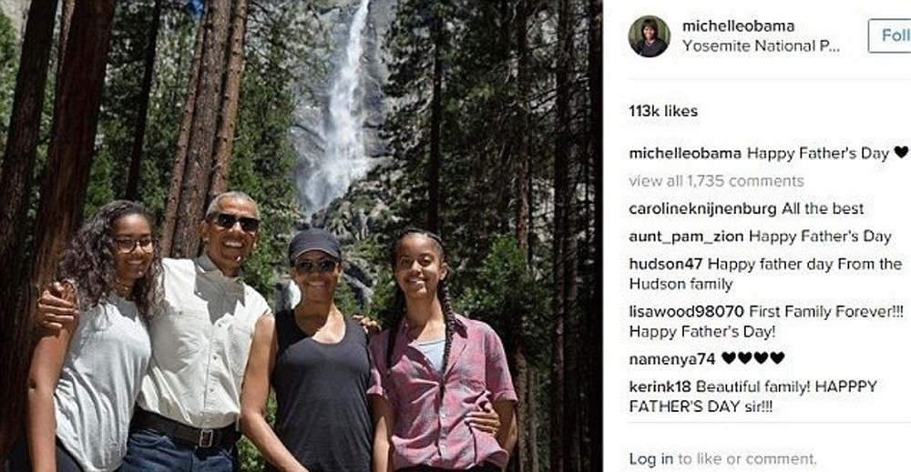 【大公報訊】據英國廣播公司報道:19日是英美等多國的父親節,許多名人紛紛在推特上傳照片慶祝。美國第一夫人米歇爾在推特貼出她與總統奧巴馬及兩個女兒的合照,上面寫?「父親節快樂!」並送上一顆大大的愛心。