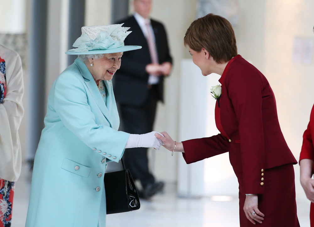 圖:英國女王伊麗莎白二世(左)2日與蘇格蘭首席大臣斯特金握手\美聯社