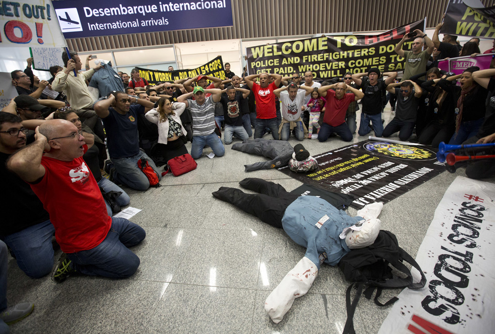 圖:巴西警察和消防員4日在里約國際機場抗議政府欠薪\美聯社