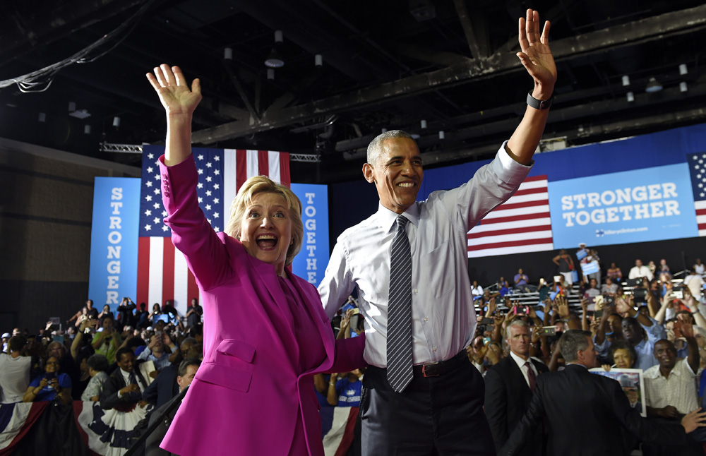 圖:奧巴馬(右)5日首次參加希拉里的競選活動\美聯社