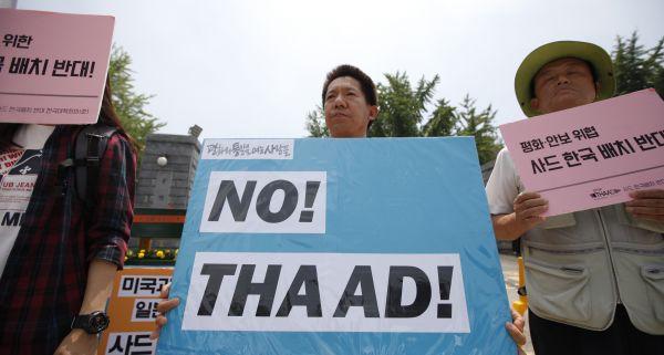 圖說: 7月8日,在位於首爾的韓國國防部門前,韓國市民團體高舉標語反對韓美在韓部署「薩德」系統。 新華社記者姚琪琳攝