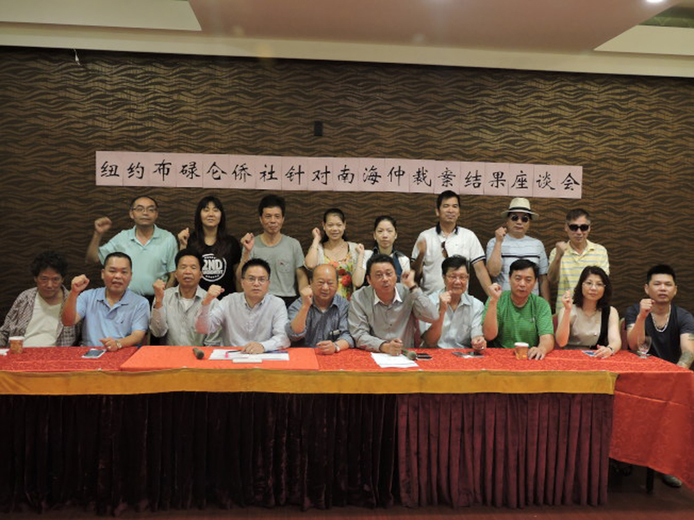紐約中國和平統一促進會聯合紐約、費城等地近30個社團發表聲明稱,美東地區華僑華人對所謂「裁決」表示強烈不滿及嚴正抗議,堅決支持中國政府和人民對非法「仲裁」不參與、不接受,對「裁決結果」不承認、不執行的態度,反對以仲裁方式解決南海爭端。
