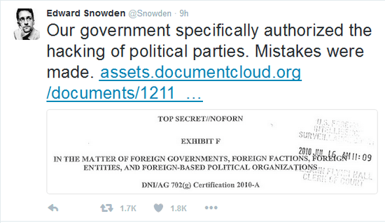 大公網7月26日訊 據俄羅斯「衛星」新聞網7月26日報道,美國中情局前雇員愛德華?斯諾登在自己的推特上表示,美國政府曾批準對國外政黨實施網絡攻擊。
