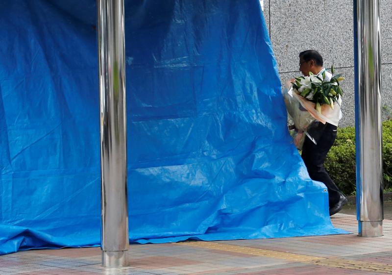圖:一名殘障中心職員26日捧鮮花到案發現場 路透社