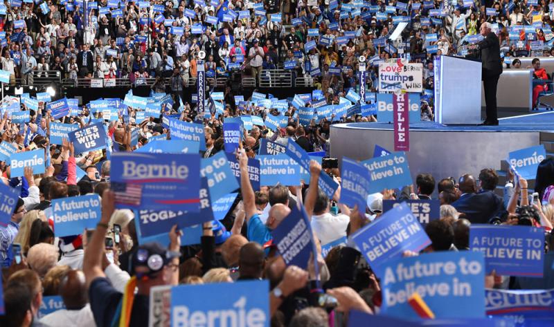 在大會會場,許多民主黨代表佩戴寫有桑德斯名字的徽章,表示對他的支持。儘管當天早些時候,民主黨全國委員會已向桑德斯及其支持者正式道歉,但是不少支持桑德斯的黨代表接受媒體採訪時仍表示不滿。他們高喊桑德斯的名字「伯尼、伯尼」。有些支持者情緒特別激動,傷心的淚流滿面;有些人兩手高舉標語牌,嘴裏喊着口號,時不時還要抽出一隻手來擦拭眼淚。