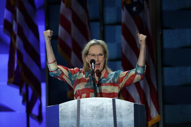 梅麗史翠普穿着印有美國國旗圖樣的襯衫來到費城為希拉里站台。梅姨說:「她的膽識哪來的?優雅哪來的?我們的女性先驅,我們的開路先鋒,她們的力量是哪來的?」