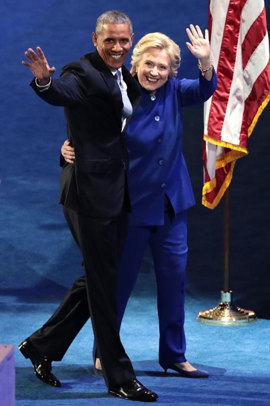 圖:希拉里(右)在奧巴馬演說結束後上台,兩人一起向觀眾揮手 法新社