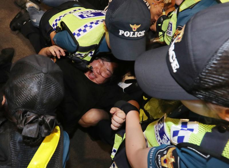 圖:韓國警方28日將示威者抬離現場 美聯社
