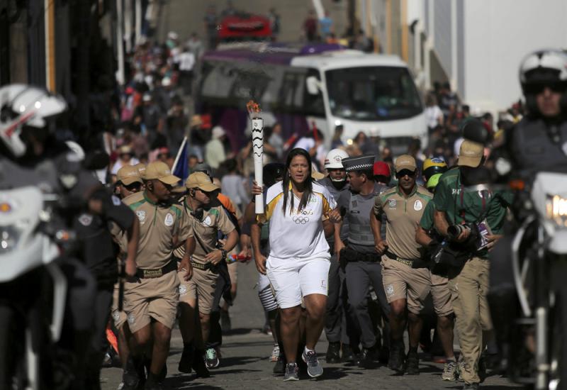圖:巴西前排球運動員桑托(中)27日在聖路易斯杜帕賴廷加市傳遞聖火\路透社
