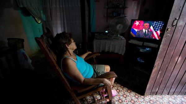 古美建交后,一名古巴婦女在家觀看美國總統奧巴馬的演說