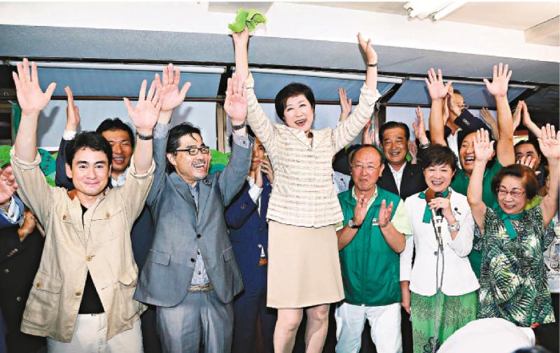 圖:小池百合子(中)和支持者一同慶祝勝選 法新社