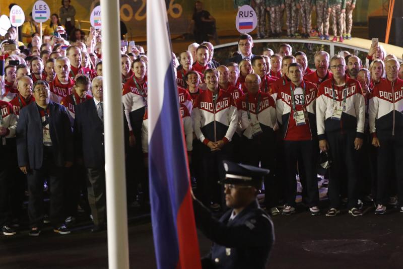 圖:俄羅斯體育代表團3日在里約奧運村舉行升旗儀式\新華社