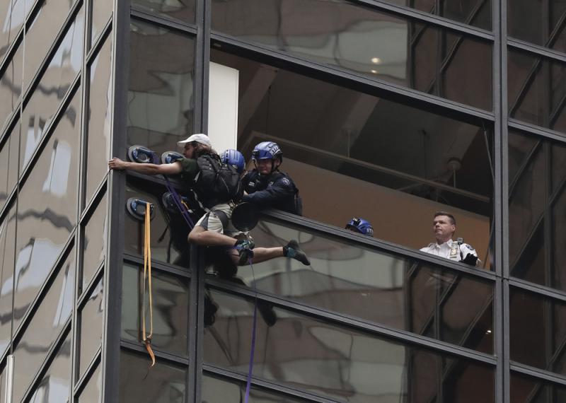 特朗普大廈的工作人員將58層樓高的摩天大廈上部的玻璃取掉,防止這名男子再繼續攀爬。當這名「蜘蛛俠」爬到大廈第21層時,警方最終抓住了他,並將他拖進大廈內。