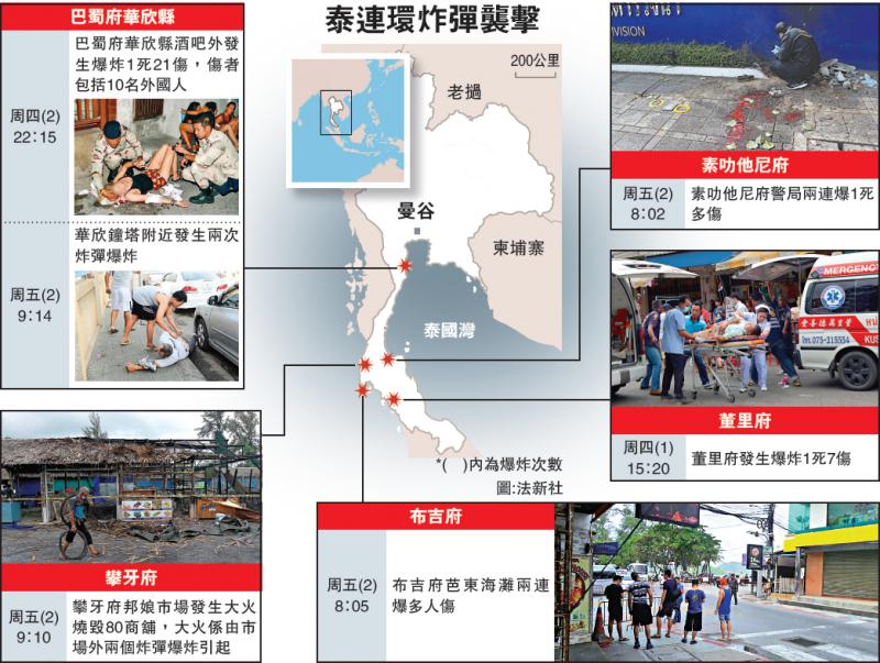 【大公報訊】綜合法新社、路透社及泰國《民族報》報道:8月11日到12日,包括港人旅遊熱點華欣在內的泰國多處旅遊勝地,遭遇多場大火和至少11次炸彈爆炸襲擊,造成至少4人死亡,多人受傷。目前暫未有組織或個人聲稱對事件負責,泰國警方認為這些暴力襲擊與伊斯蘭恐怖主義沒有聯繫,但有可能與7日公投通過的憲法草案有關。