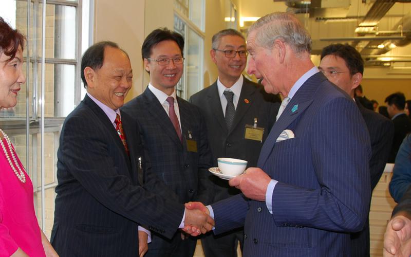 圖:英國傑出華人領袖、泗和集團主席謝貴全2015年2月在「中國站」交易會上與查爾斯王子握手 受訪者提供
