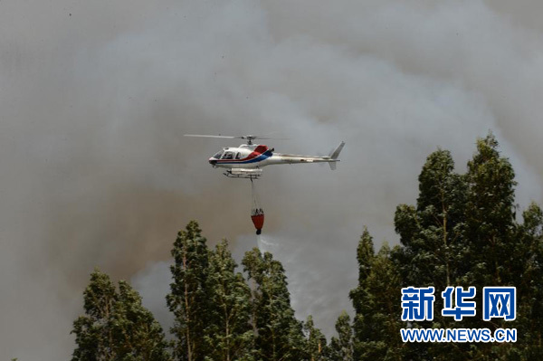 6月18日,一架直升機在葡萄牙中部大佩德羅岡地區參與撲救森林大火。新華社記者張立雲攝