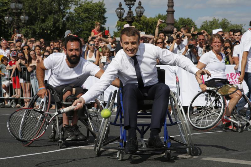 圖:馬克龍坐在輪椅上和民眾打網球 美聯社