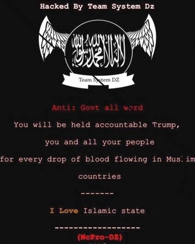 在純黑背景下,黑客留言說,「特朗普你要為此負責,你和你的人民要為穆斯林國家流下的每一滴鮮血負責。」結尾還寫道,「我愛伊斯蘭國。」