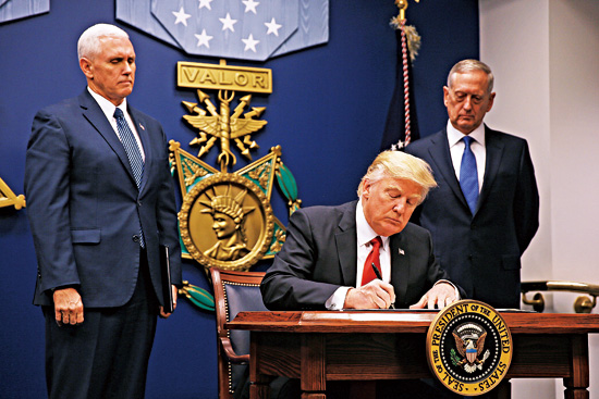 美國總統特朗普(中)3月6日簽署新的旅行禁令(資料圖:路透社)
