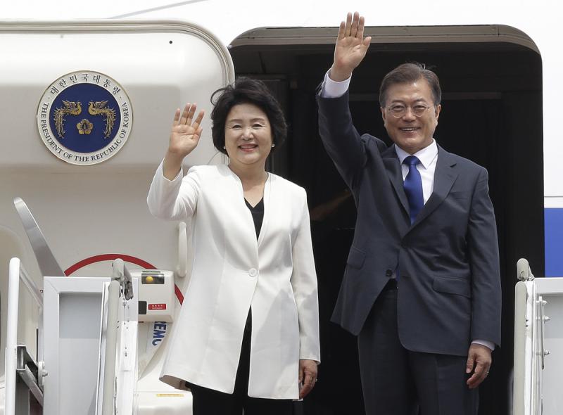 圖:韓國總統文在寅(右)與夫人金正淑28日搭乘專機前往美國 美聯社