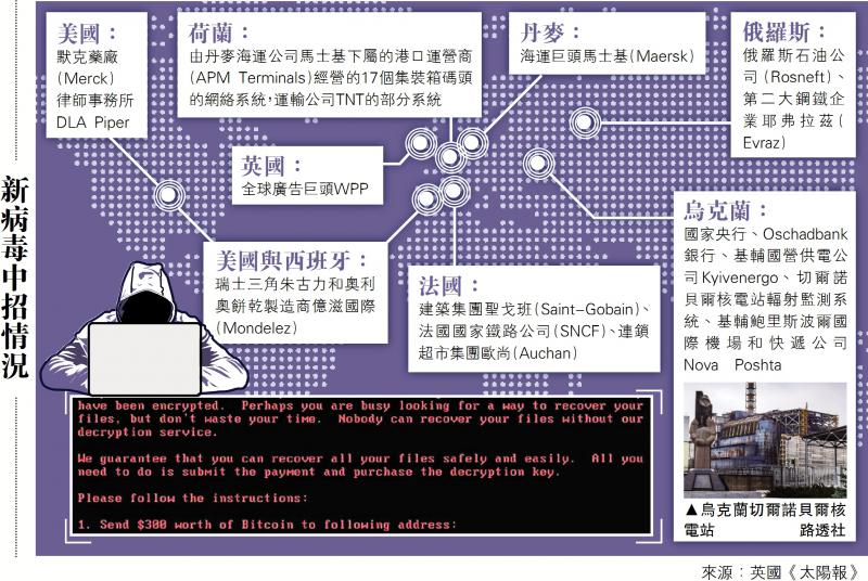 英國、法國、德國、丹麥、意大利、美國、印度等國也受到影響。全球海運巨頭丹麥馬士基航運集團、全球最大傳播服務企業英國WPP集團、美國醫藥巨頭默克公司均在受害者之列。