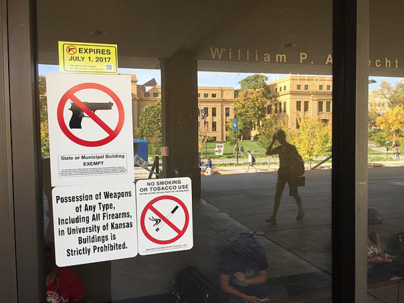 圖:美國堪薩斯州一所大學的禁槍標誌牌顯示「7月1日到期」/網上圖片
