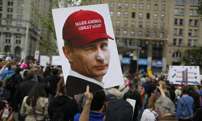 圖:示威者上月在紐約高舉普京海報,諷刺美俄關係\網上圖片