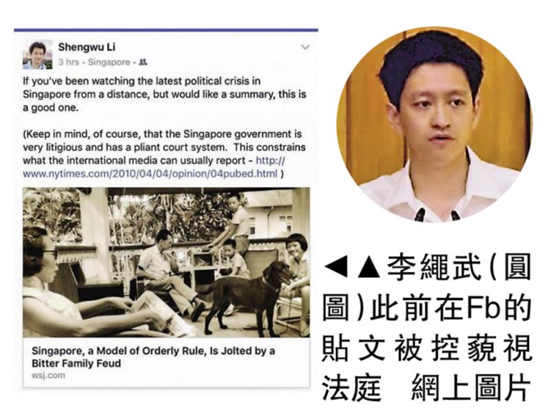 圖:李繩武(圓圖)此前在Fb的貼文被控藐視法庭/網上圖片