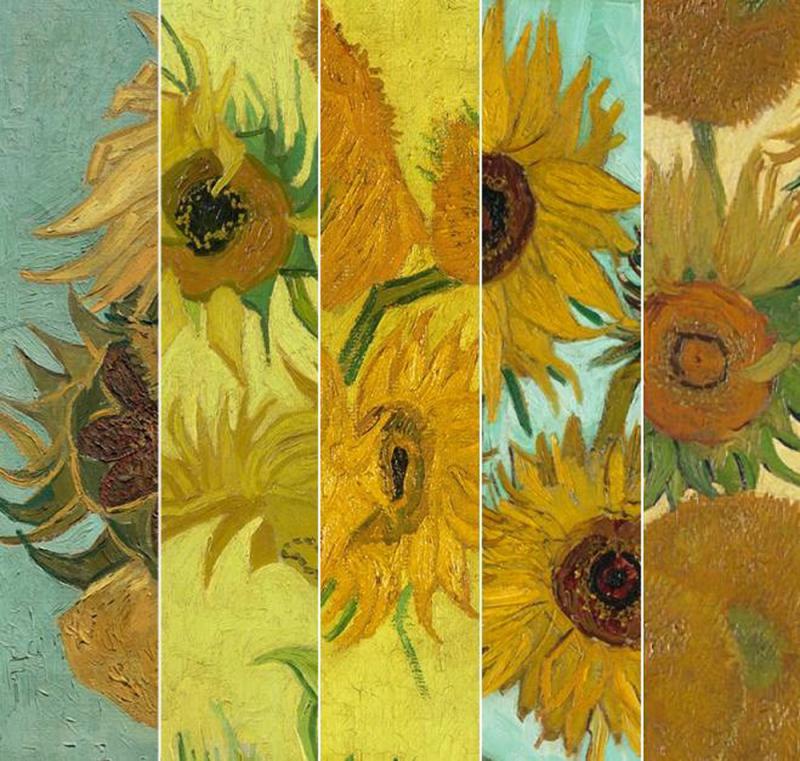 圖:梵高五幅《向日葵》畫作的部分細節 網上圖片