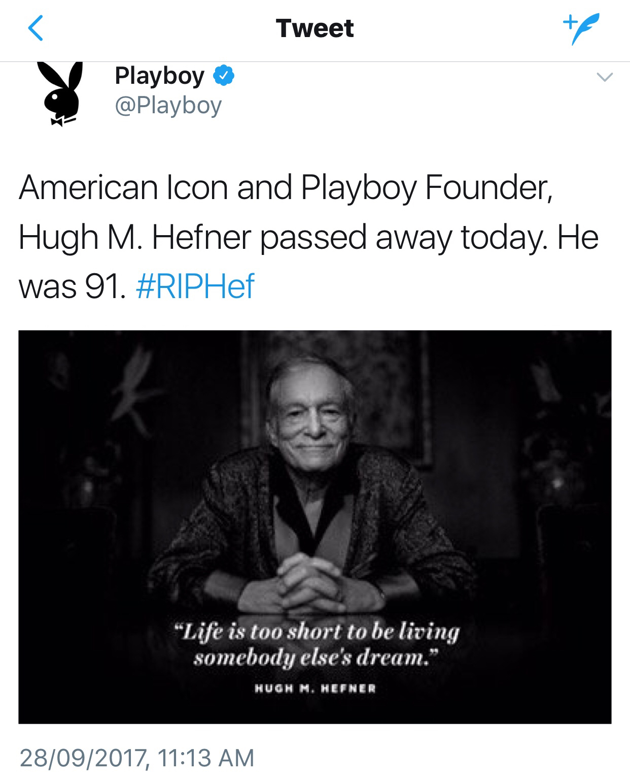 大公文匯全媒體綜合報道:美國《花花公子》雜誌在官方推特上發布聲明,《花花公子》雜誌創辦人休·海夫納(Hugh M. Hefner)去世,享年91歲。聲明指其死於自然原因,離世時親友都陪伴在側。