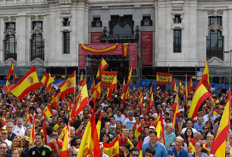 在首都馬德里,數千人在中央廣場集會,揮舞黃紅兩色的西班牙國旗,抗議加泰羅獨立公投,不少人高喊「西班牙萬歲」、「加泰是西班牙的一部分」以及「我是西班牙人」。部分人還要求將推動獨立公投的加泰地區領導人普伊格德蒙特逮捕入獄。58歲的工程師塞佩達表示,「我們不應該走到無法轉彎的地步。」