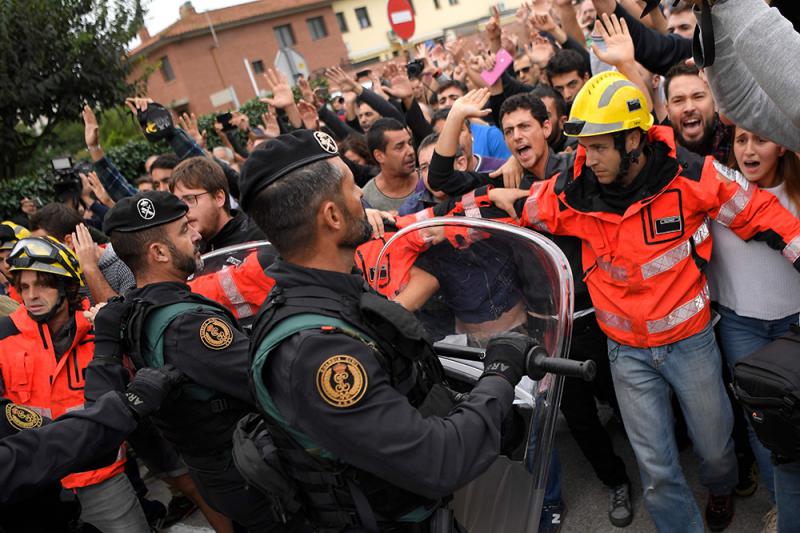 圖:加泰消防員(右)1日與西班牙警員對峙\法新社