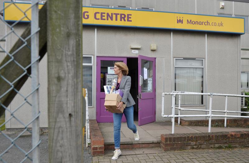 圖:一名員工2日離開英國盧頓機場的君主航空辦公室\路透社