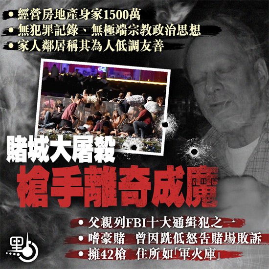 大公文匯全媒體綜合報道:美國拉斯維加斯的血腥槍擊案槍手,64歲的白人男子帕多克已吞槍自殺,但其行兇動機仍然成謎。有傳媒發現他早年靠投資地產致富,無論家人還是鄰居均指他為人低調友善。此前也無任何犯罪記錄,沒有任何極端宗教或政治思想。但看似如常的表象之下,帕多克的生活也有不為人知的一面。其父曾連環打劫銀行,更因越獄列FBI十大通緝犯之一。帕多克本人嗜好豪賭,還因滑倒就怒告賭場,最終敗訴。最令人感到恐怖的是,他擁有42把槍、數千發子彈及爆炸品,住所如「軍火庫」。帕多克的「成魔之路」可謂離奇,對於作案動機,警方目前仍在調查中。