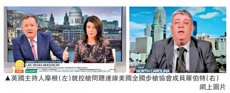 【大公報訊】據英國《鏡報》報道:拉斯維加斯發生美國近代史上傷亡最慘重的槍擊案,造成至少59人死亡,500多人受傷的慘劇。英國反擁槍主持人摩根3日在《早安英國》節目訪問美國全國步槍協會(NRA)成員羅伯特,就擁槍問題展開討論,場面十分火爆。