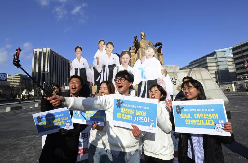 圖:韓國大學生10日在朝鮮美女啦啦隊的紙牌前拍照 /美聯社