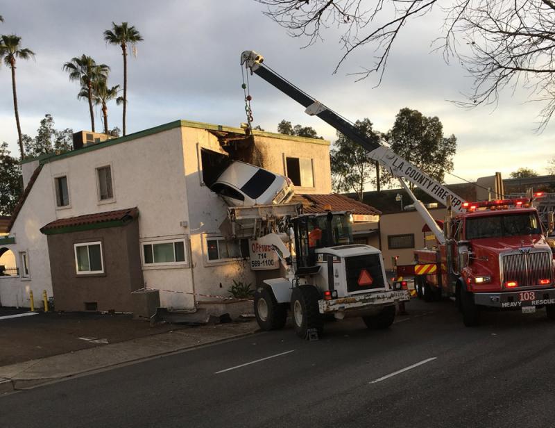美國加利福尼亞州聖安娜(Santa Ana)14日清晨發生謎一樣的車禍。意外現場只見一輛白色日產汽車插入一間牙醫診所的二樓,車尾懸吊半空。意外引發小火,車內兩人受輕傷,肇事司機坦承曾食用毒品。警方估計司機以「極高速」行駛,然後撞上安全島,車身飛向街對面,撞進二樓。過程實在像極了電影《炮彈飛車》(The Cannonball Run)畫面。/美聯社