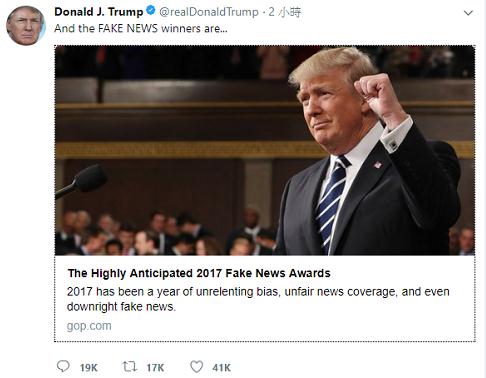 美國當地時間17日晚上,特朗普在推特上公布他所稱的2017年「假新聞」獎(特朗普推特)