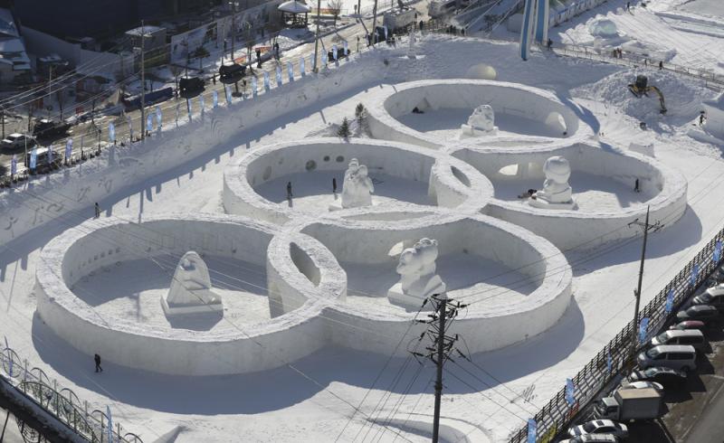 圖:韓國平昌冬奧舉辦地用雪雕出的奧運五環\法新社